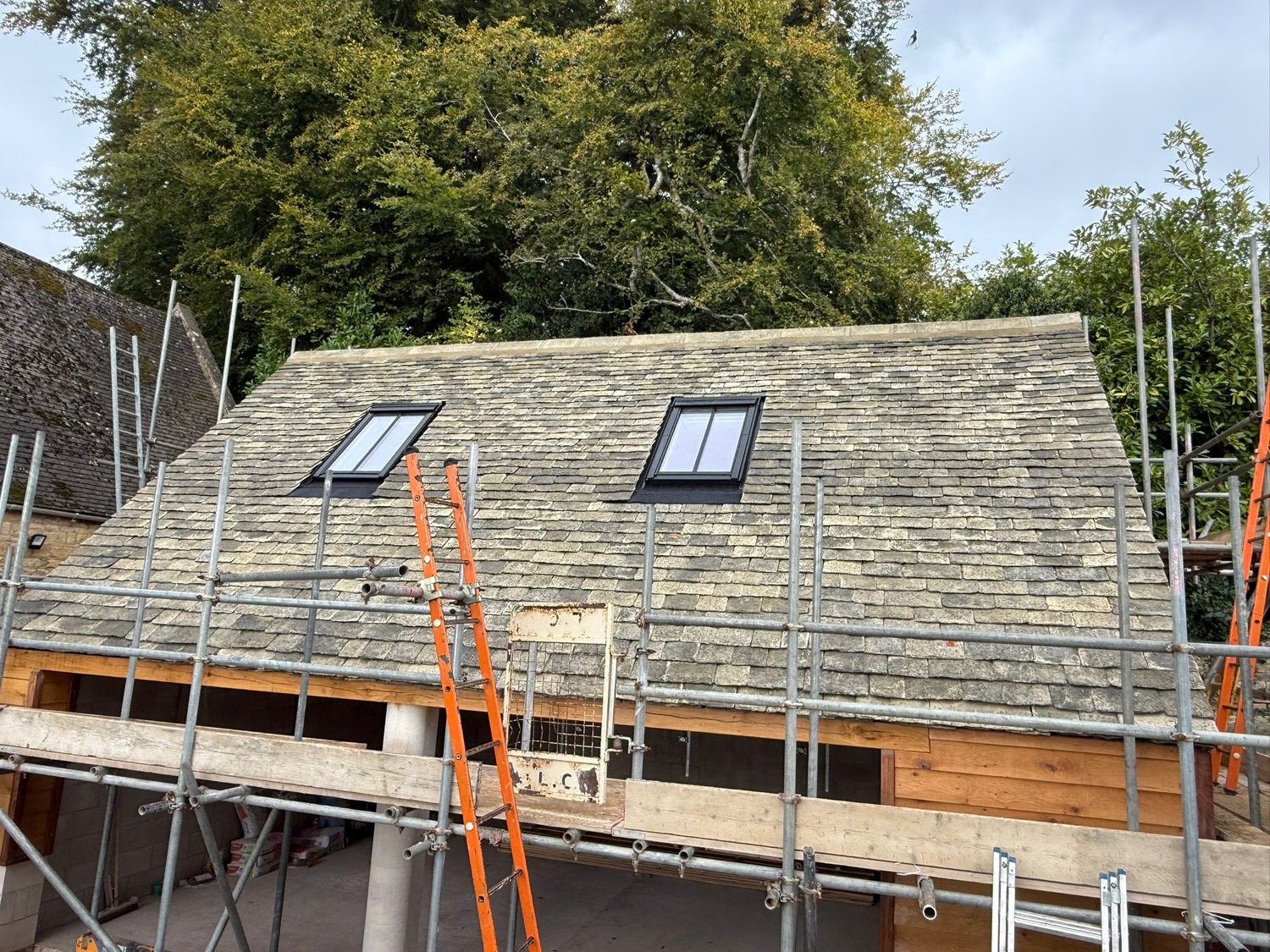 Cardinal Imitation stone slates with two Velux roof windows installed